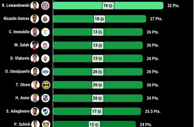 随着新一轮联赛的结束,欧洲金靴奖排名也进行了更新。莱万依然位居第一,而五大联赛的球员排名逐渐上升,一些小联赛的球员排名慢慢往下掉。但前10依然不见梅西和C罗的身影。