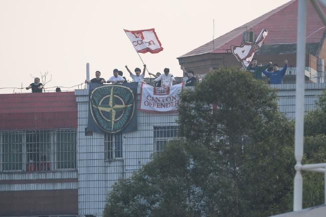 泪奔!广州队球迷楼顶举横幅助威 他们一直都在