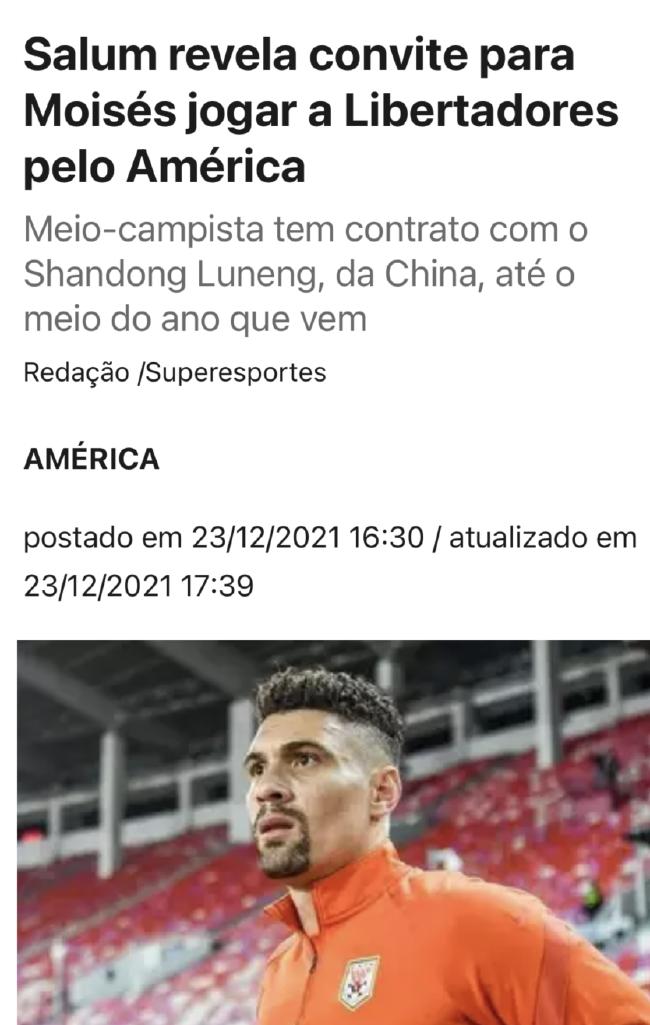 萨鲁姆表示:“今天,我和在中国的莫伊塞斯通了电话。我问他是否想代表米内罗美洲队参加解放者杯比赛,但他说我的合同要到明年年中,他们想要更新我的合同。然后,我说好吧,也许你会改变主意。我想要像莫伊塞斯这样的战士参加解放者杯比赛。”