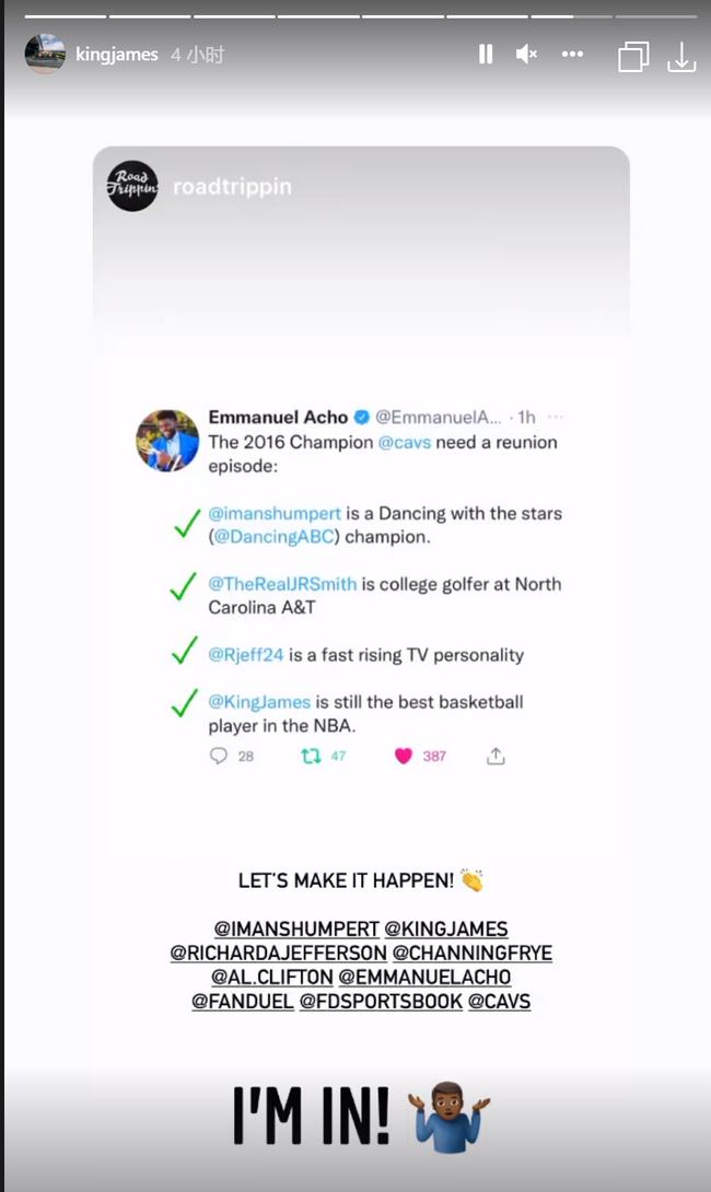 之后,凌晨三点,詹姆斯转发了老队友理查德-杰弗森、钱宁-弗莱创办的Road Tripping播客官方账号转发的一条动态。
