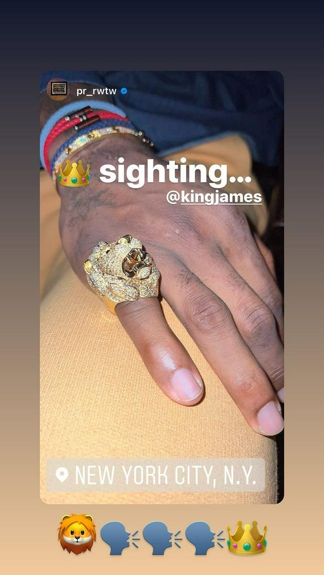 最后,詹姆斯转发了一张友人拍摄的他今日在纽约佩戴的狮子头怒吼形象的金戒指照。