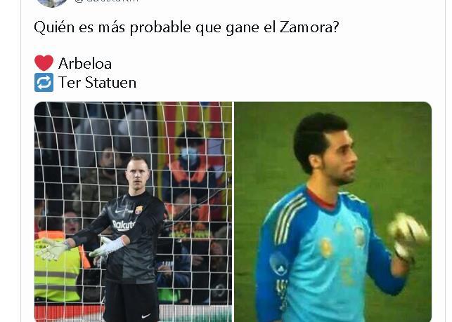 有球迷将特尔施特根和前皇马后卫阿韦罗亚进行了比较,并表示:“这两位谁更能获得西甲最佳门将称号?”