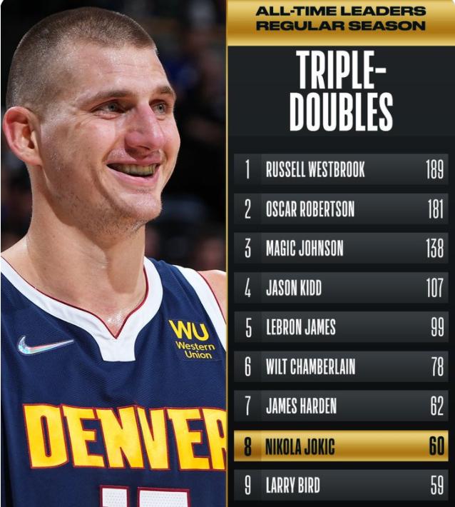 这是他职业生涯第60次三双。上一次他达到59次时,平了拉里-伯德,并列第8,今天再次达标后,独占第8的位置。