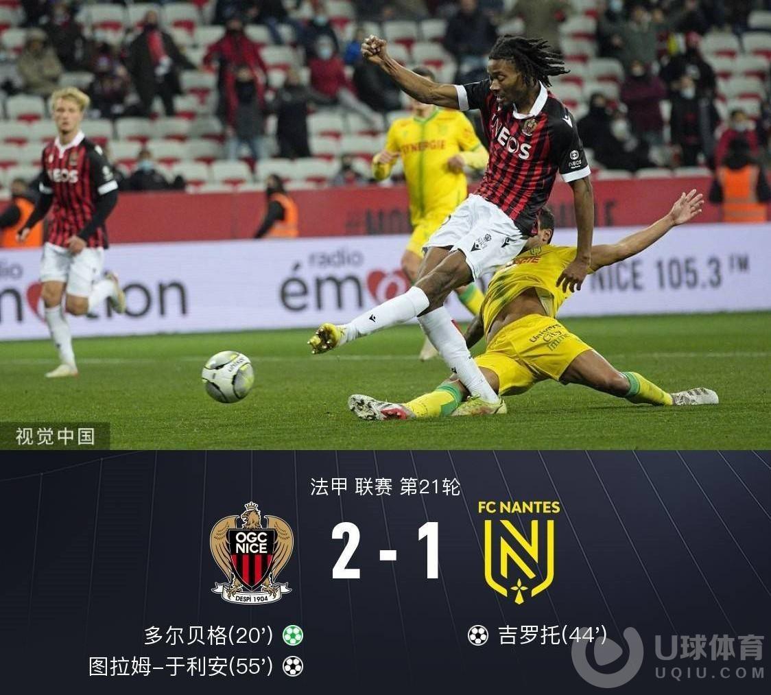 北京时间1月15日04:00,法甲第21轮,尼斯主场迎战南特。本场比赛丹特造点,多尔贝格点射率先破门,吉罗托扳平比分,图拉姆-于利安建功。最终,尼斯2-1南特。