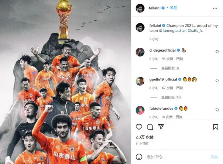 费莱尼在微博中晒出泰山夺冠的照片,并在INS中写道:“Champion 2021。。。proud of my team !”