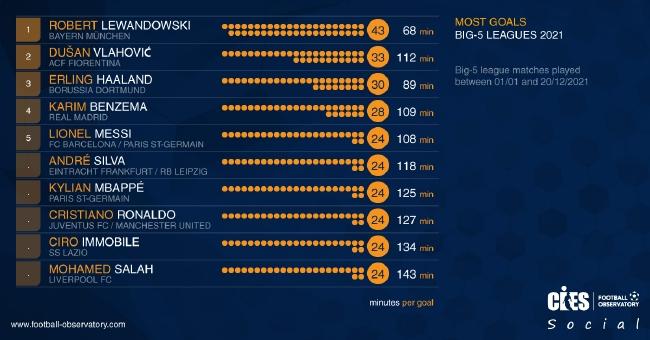 瑞士足球天文台CIES日前盘点2021年五大联赛球员在联赛中的进球数,莱万多夫斯基以43球排第一,梅西排第5,C罗排第8位。