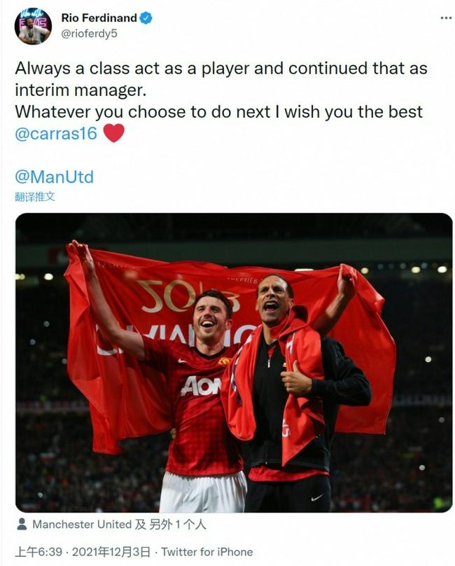 曼联名宿费迪南德在社交媒体上向自己的老队友告别,他写道:“无论是作为球员还是临时主帅,你总是奉献顶级表现。无论你接下来选择做什么,我都祝你一切顺利。”