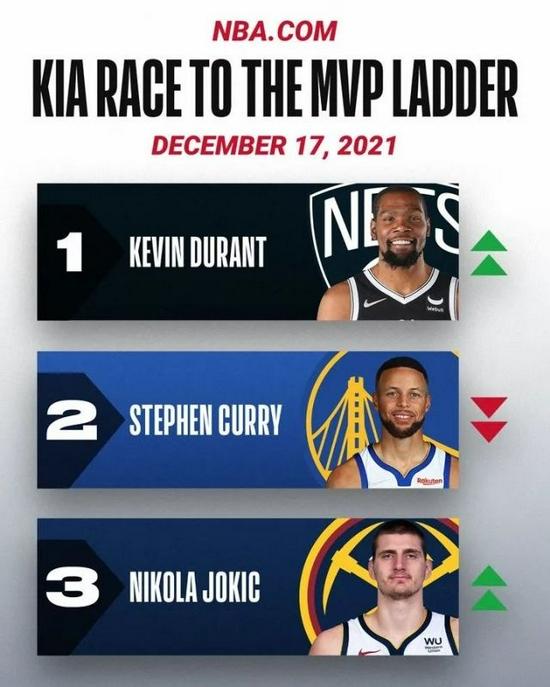 过去三场比赛,在哈登无法出战的情况下,杜兰特每场都至少拿到了34分7篮板8助攻,率领球队取得三连胜。在官方的MVP榜单上,杜兰特反超库里排到了联盟第一。